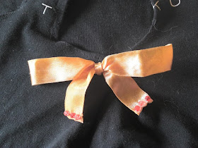 Pari pesua koneessa ja yksi rusetti alkoikin repsottamaan. Ei hätiä mitiä, otin neulan käteen ja aloin siistimään. Ei mutta tähänhän menisi kivasti muutama helmi... Ennen kuin huomasin kuvata, olin jo ommellut toisen nauhan päistä...